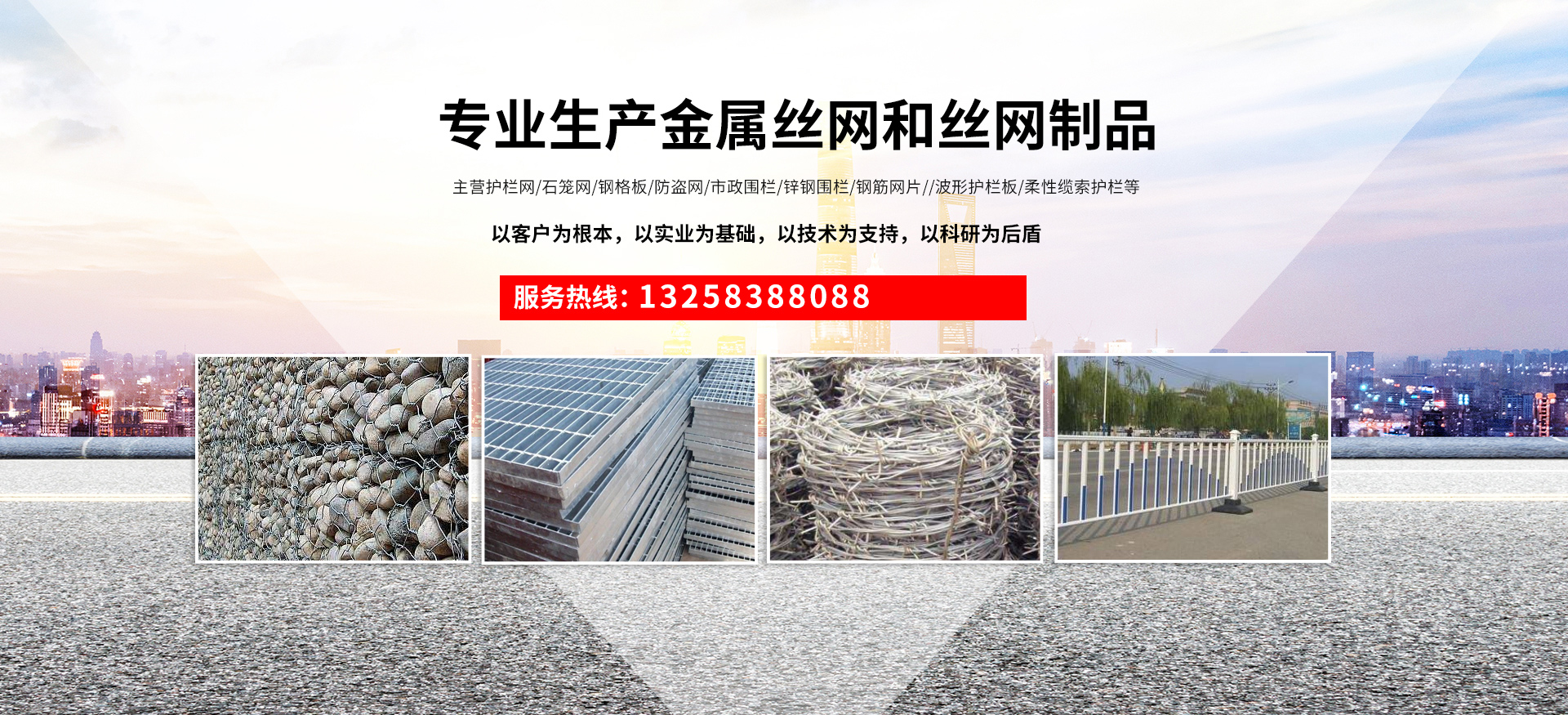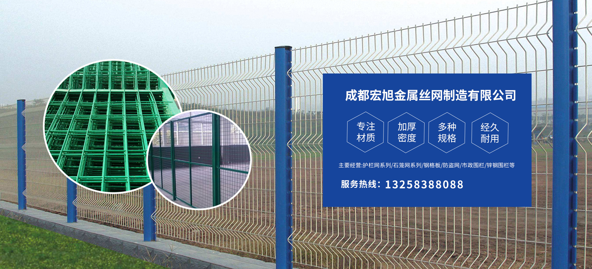 成都宏旭金屬絲網制造有限公司主營護欄網系列、石籠網系列、鋼格板、防盜網、市政圍欄、鋅鋼圍欄、鋼筋網片、聲屏障系列、波形護欄板、柔性纜索護欄、SNS邊坡防護網等其他絲網類產品。特殊規(guī)格可加工定做,也可根據(jù)客戶來圖來樣定做。自創(chuàng)業(yè)以來,公司一直堅持市場為導向,以客戶為根本,以實業(yè)為基礎,以技術為支持,以科研為后盾,集科研、生產、經營為一體,不斷研制開發(fā)新產品,開拓市場,走綜合發(fā)展之路。多年來,公司憑借過硬的質量,良好的信譽、優(yōu)質的服務、合理的價格,贏得了市場和商家的一致好評。